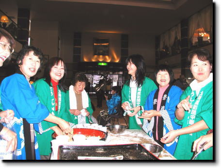 平成17年「新春持ちつき大会」(1/3・クラッセホテル)![]() お餅を丸めるハッピ姿のお姉さん(?)たち |