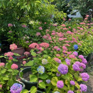 百想園のアジサイは、今年は7月に入っても比較的雨に恵まれて、花の状態はとても良いです。八重咲きやバラ咲きのような園芸品種も7月下旬から8月中旬まではきれいな花をつけていると思います。また、その後も秋色に変化するアジサイを10月下旬まで楽しめるのが、百想園の最大の魅力。どうぞお気軽にお立ち寄り下さい。