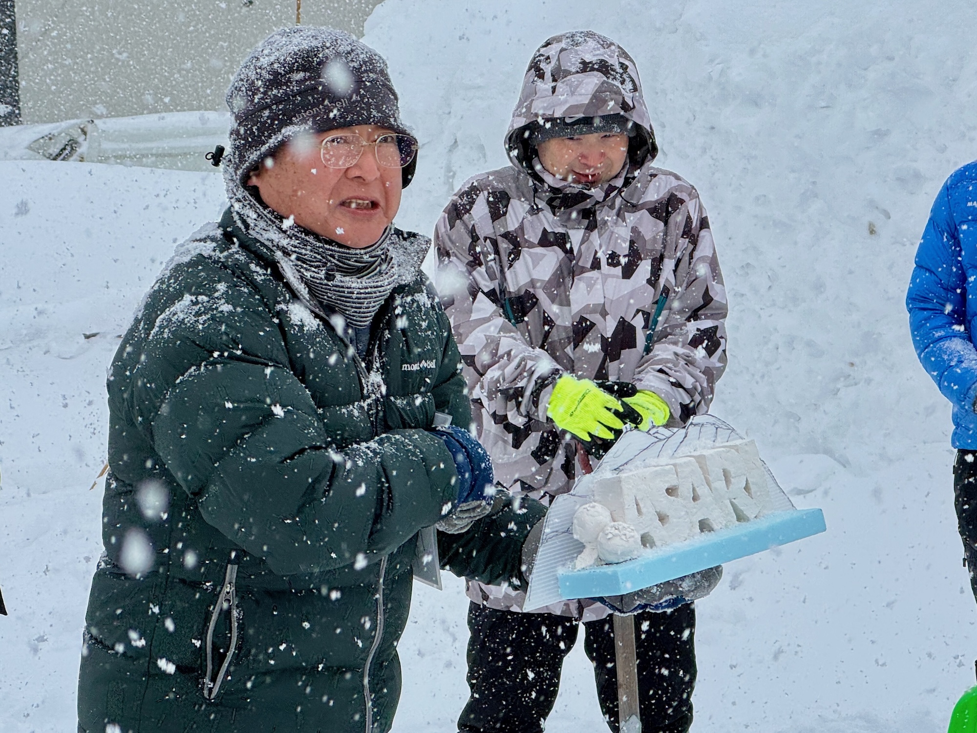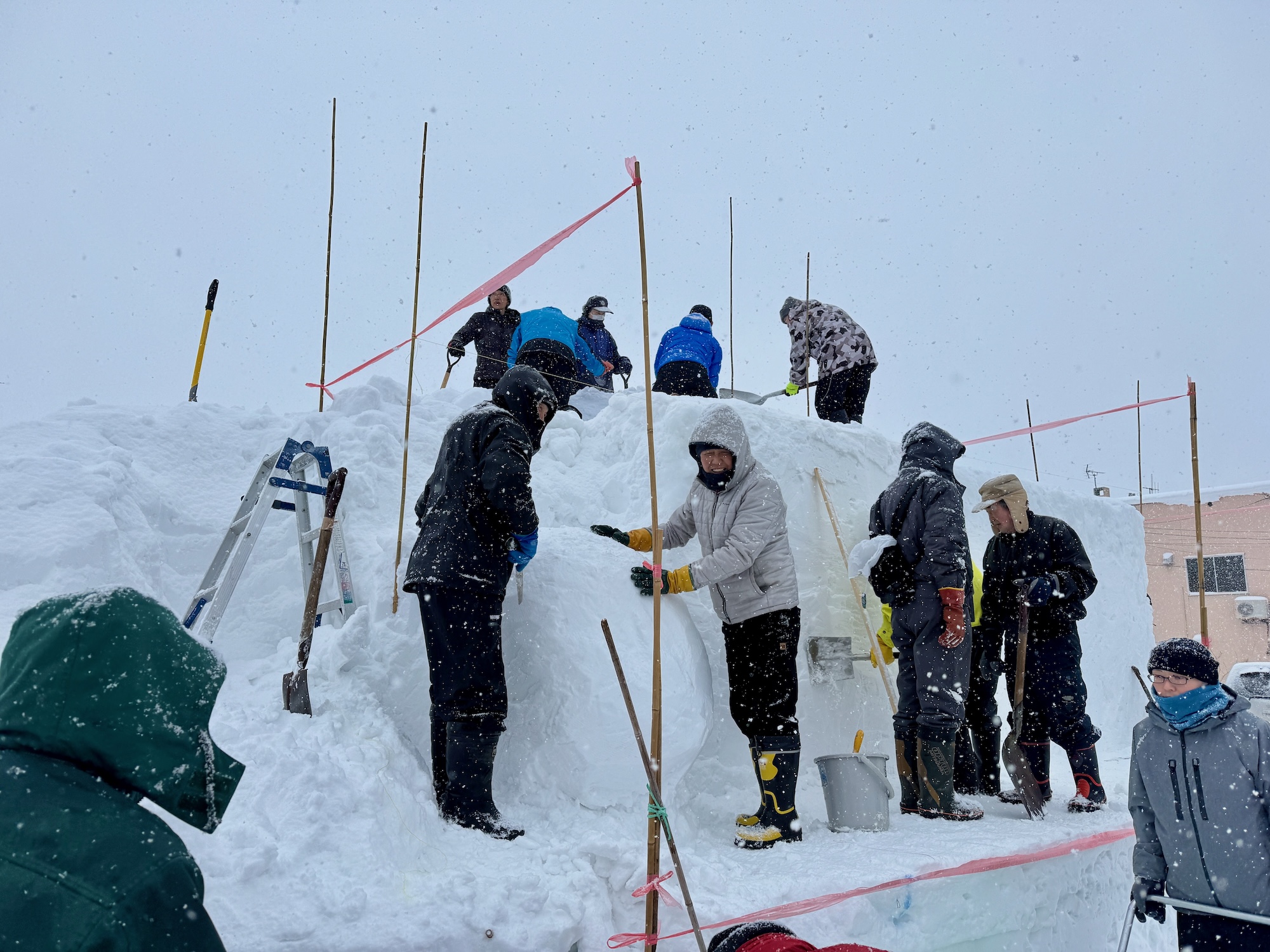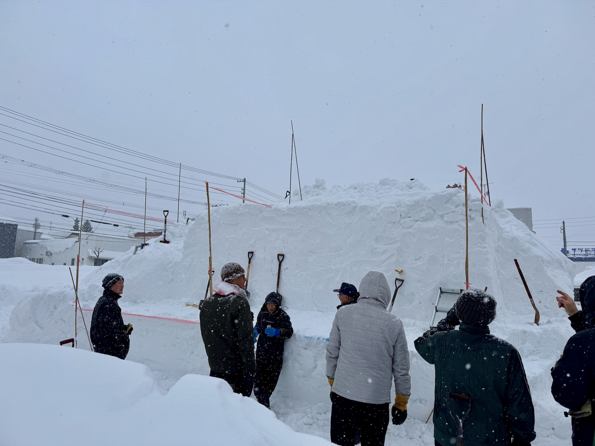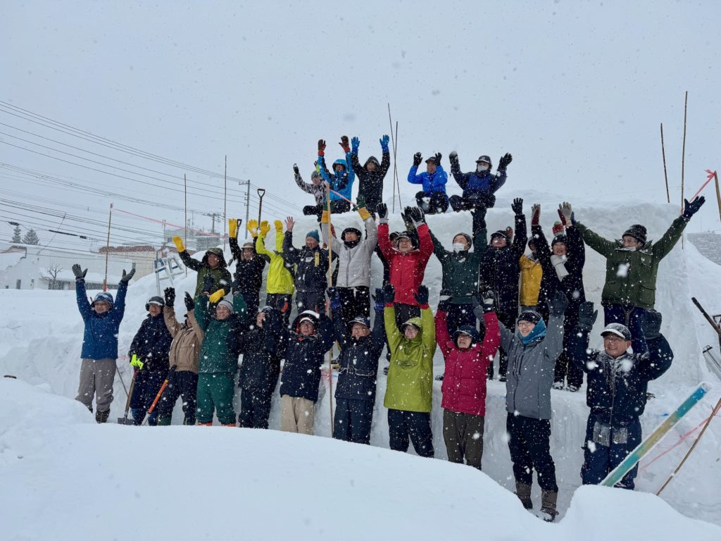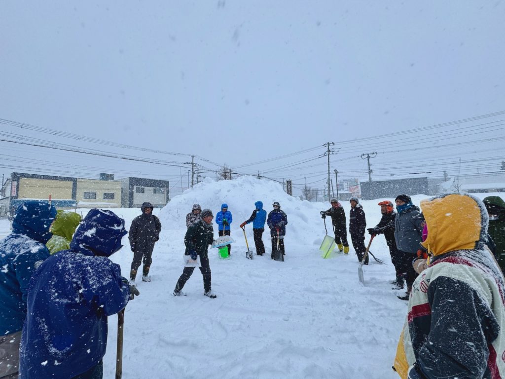 あいにくの雪模様でしたが、総勢35名で約2時間の作業は雪質の良さもあってはかどり、予定していた土台部分までの作業を終えました。明日2月1日(日)も午前9時から作業します。