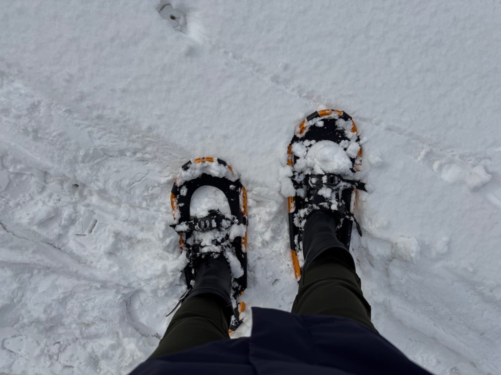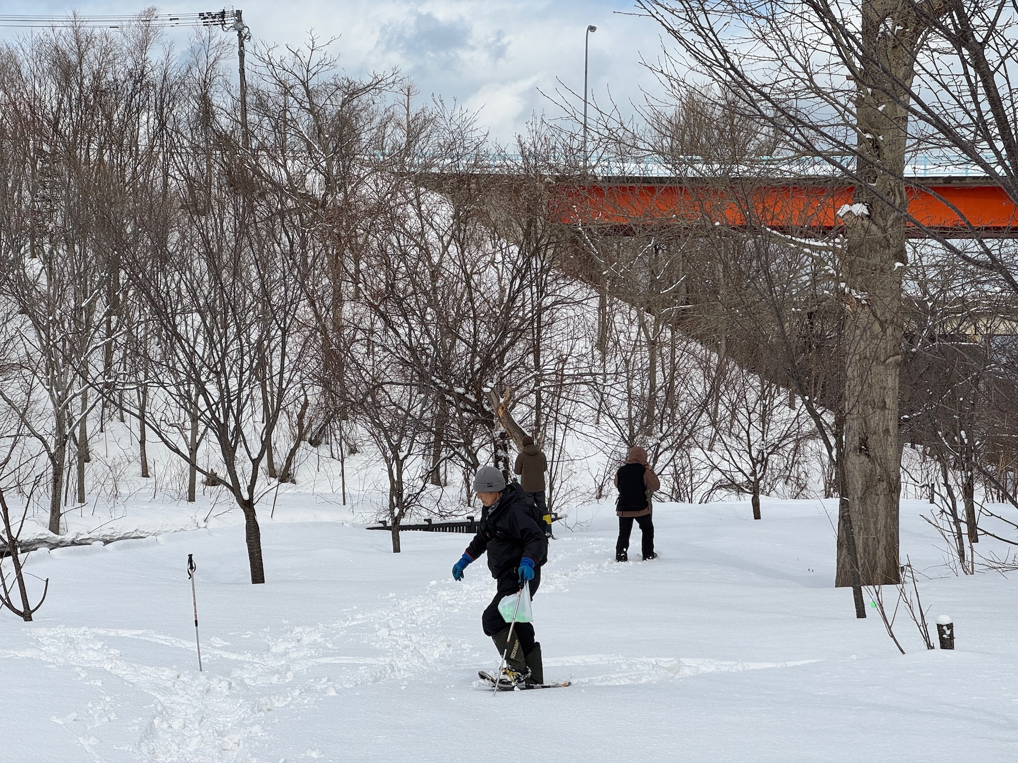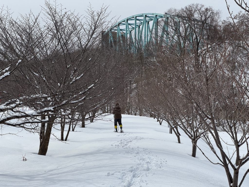 この日は朝方に気温が下がって雪も降り、作業中も小雪が舞う天候でしたが、風はなく気温も0度くらい。雪山歩きをされるメンバーからスノーシューを借りて、ストックを手に朝里川沿いを歩くと気持ちよく体が温まりました。