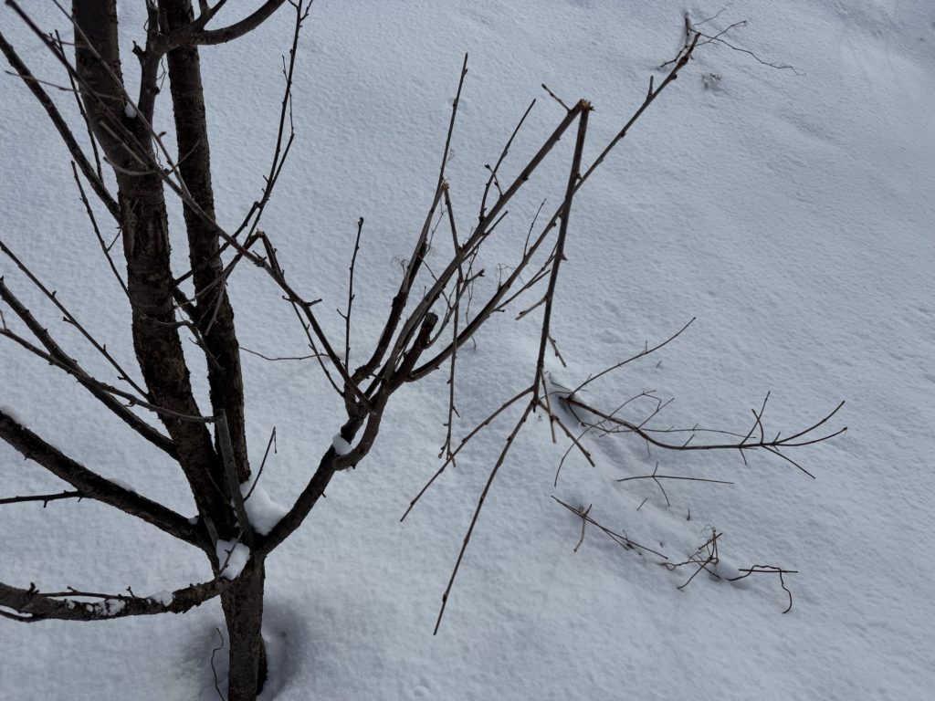 例年崖上からの落雪で被害が多かった桜並木ですが、今年はこの大雪にも関わらず、崖上に駐車場のある会社が下に雪を落とさない配慮をしてくださったので、どの桜もしっかり直立していました。