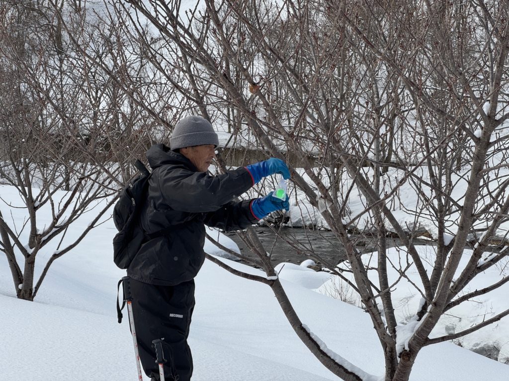 2022年にエゾシカの食害で桜並木に大きな被害が出てから、毎冬行っているネオボール(芳香剤)を吊るす作業です。鹿は主に八重桜「関山」を食べるので、今年も遊歩道と百想園で100個を吊るしました。