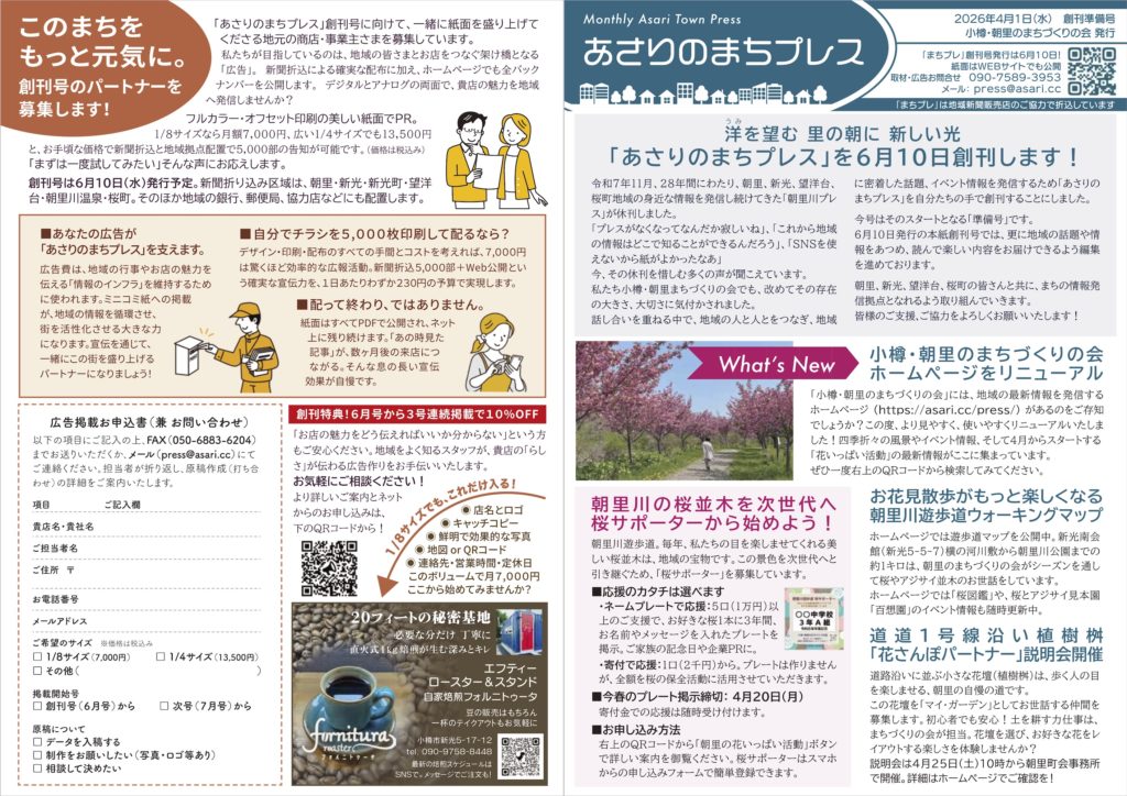 『あさりのまちプレス』は月1回(毎月10日)発行、5000部 A4サイズ4ページ(A3サイズ二つ折り)フルカラー印刷 で、2026年6月10日創刊 を計画。