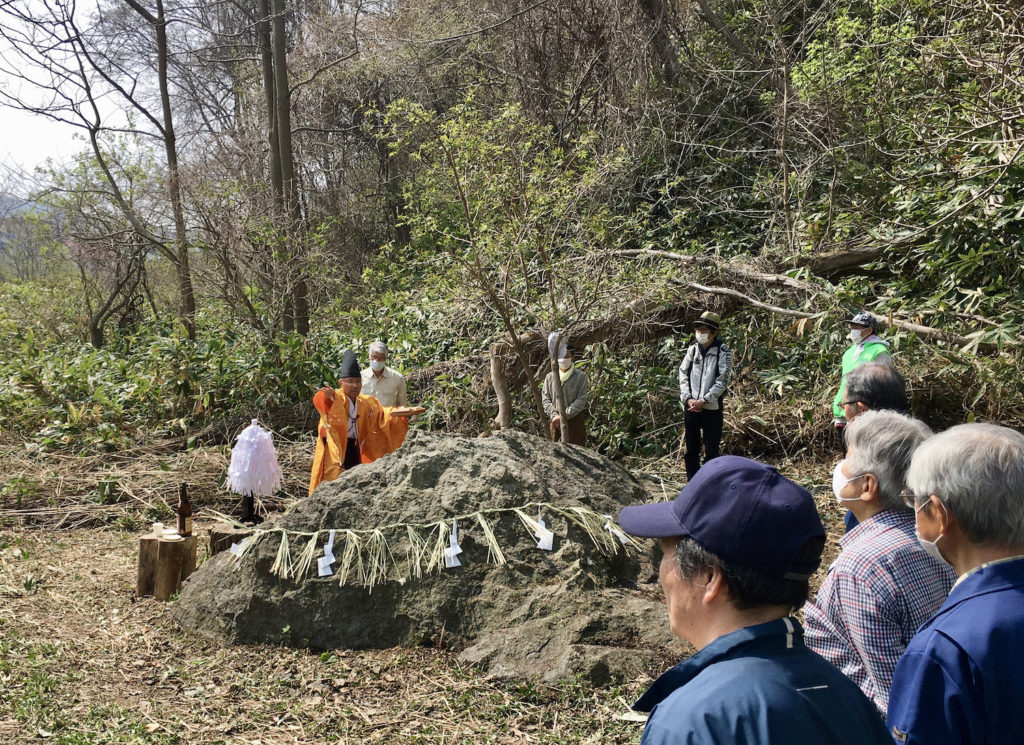 2020年5月3日(日)午前10時から、国道5号線朝里橋の下に位置する太平山・奥の院の盤石のしめ縄張替えを行いました。朝里のまちづくり会員と朝里町会女性部、そして小樽市の観光振興室から日本遺産担当の田中洋之主幹も加わっての19名が参加。森建丸宮司が祈願祭を執り行いました。