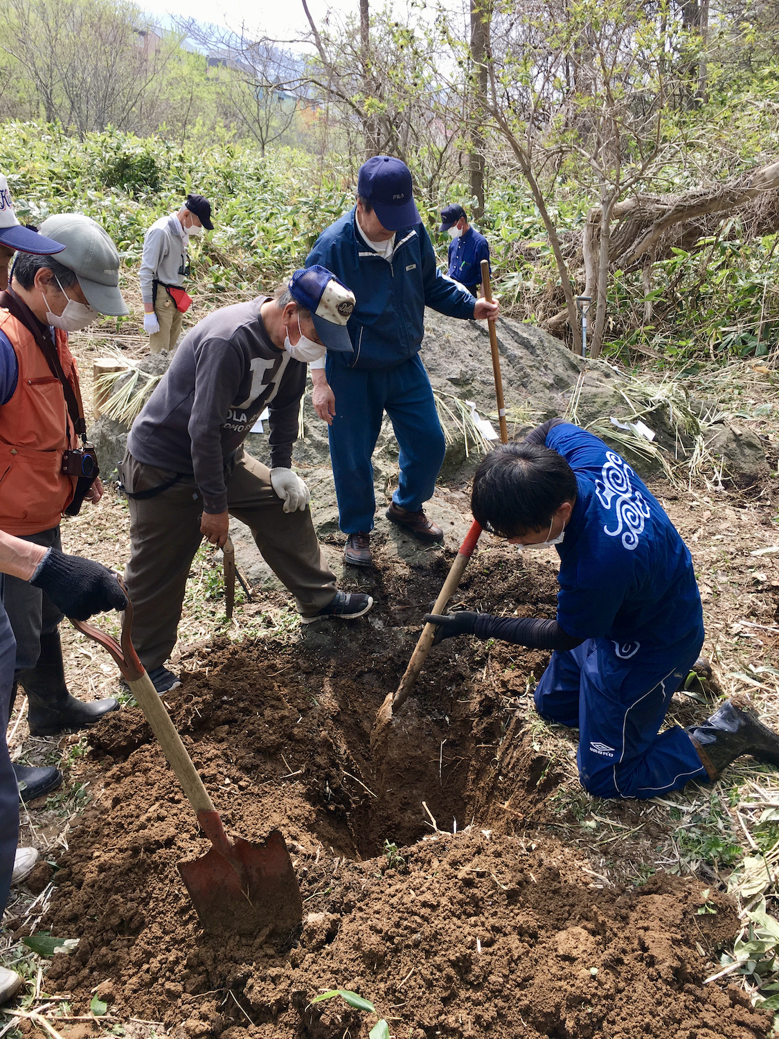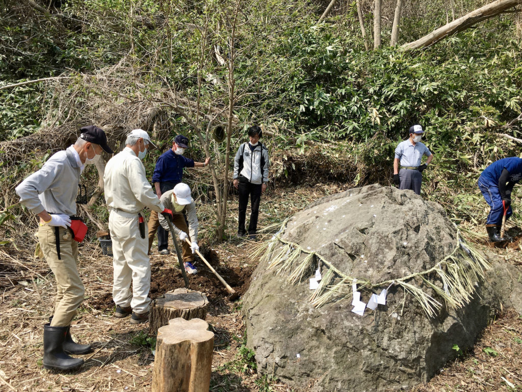 奥の院のしめ縄張替えをまちづくりの会で行うようになって10年ほどになりますが、石の周りに落ち葉や土砂などが堆積して、小さくなったような感じがします。それで実際にはどのくらいの大きさなのか、調べてみたいと「朝里遺産部会」が提案し小樽市に問い合わせたところ、このあたりにはアイヌチャシが点在するので、むやみに掘らないようにとの注意があり、この日は市職員立ち会いでの調査試掘となりました。