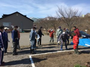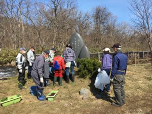 4月10日(土)午前9時より、朝里川遊歩道と百想園の冬囲い外し作業を行いました。前日は季節外れの雪で寒さが戻っていましたが、この日は快晴で風もなく、作業には快適な好日となりました。朝里のまちづくりの会員16名が集まり、黙々と作業を進め、すべての雪囲い外しと、遊歩道にベンチの設置を終えました。