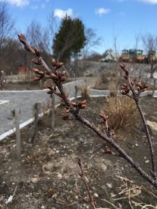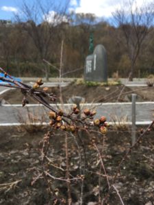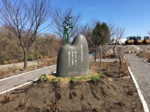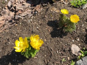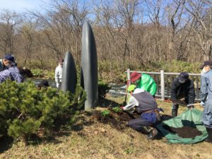 また、松前の桜守・浅利政俊先生から贈られた福寿草の苗を、百想園の「アサリの碑」と、遊歩道の石井有人文学碑の周りに植栽しました。春一番に雪解けするのがこのモニュメントの周りなので、来春は黄色い花が春を告げてくれることでしょう。去年暮れに送っていただいた福寿草は、アジサイ花壇の中できれいな花を咲かせています。